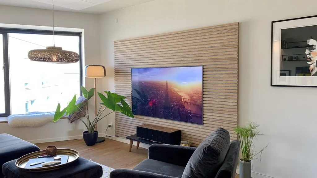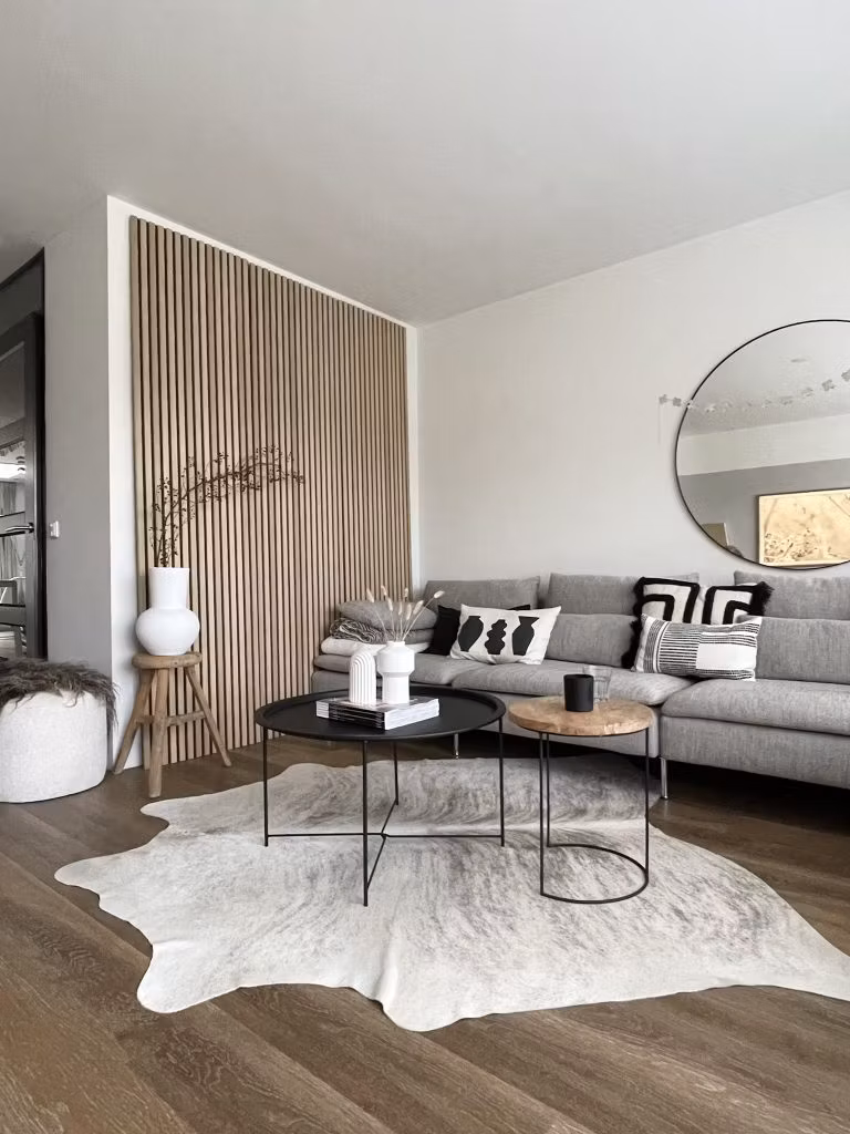 Woonkamer: Een woonkamer met een serene sfeer en vrij van echo’s, dankzij de wandpanelen.