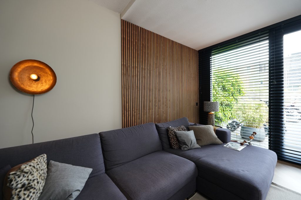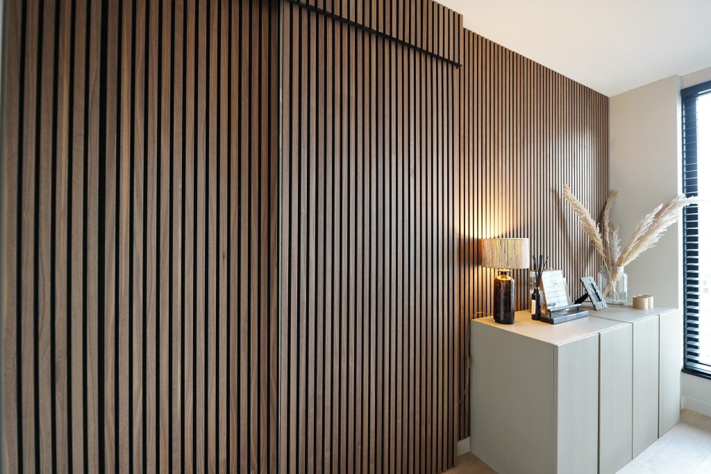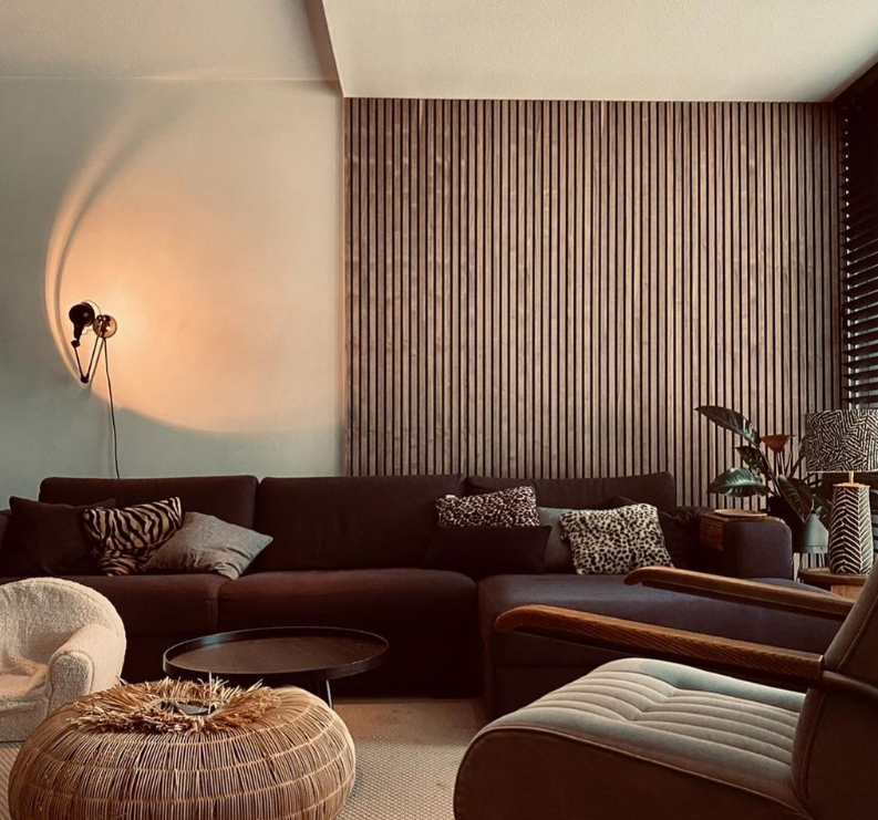 Pamela had genoeg van haar kale muren en wilde iets unieks creëren. Ze besloot om onze panelen in de warme kleur Walnoot te gebruiken, en dat heeft de ruimte een prachtige en unieke sfeer gegeven.