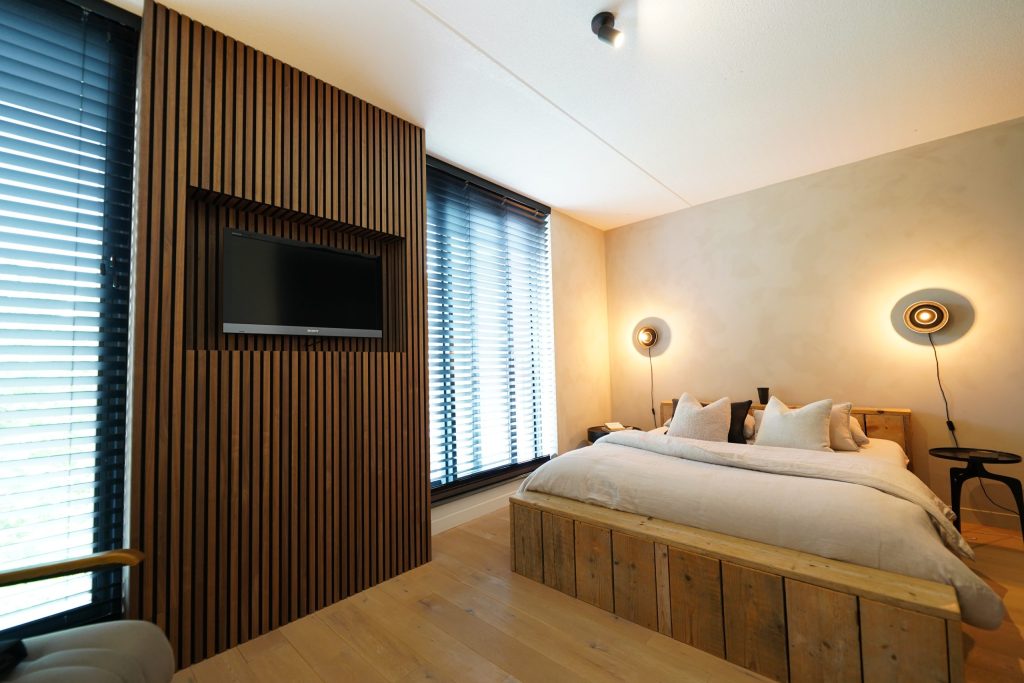 Het interieur ademt een Scandinavische sfeer uit, met houten elementen en prachtige zwarte en beige accenten.