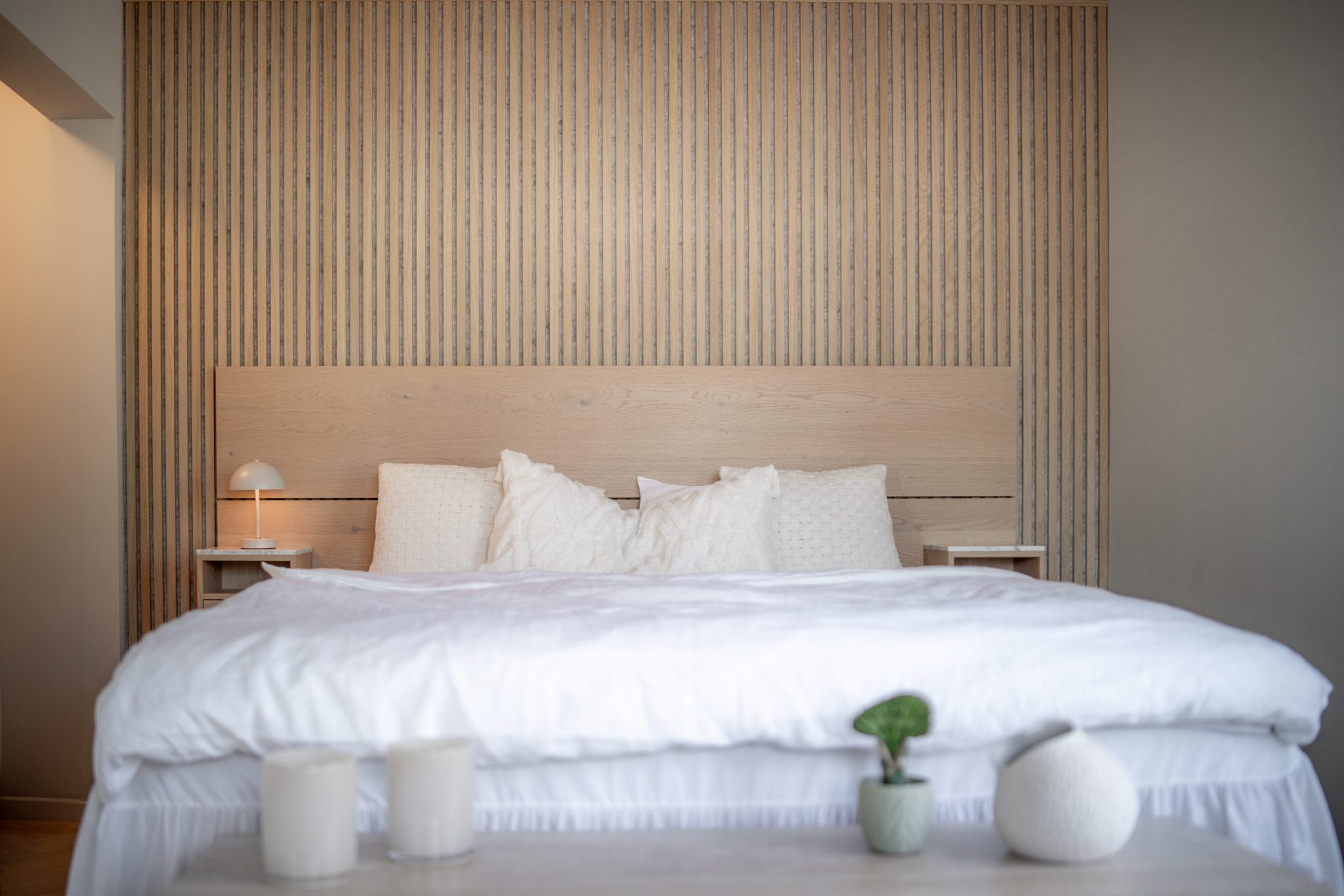 Door het toevoegen van een rustgevend kleurenpalet, een paar doordachte details en het gebruik van houten wandpanelen, hebben ze de slaapkamer getransformeerd in een warme en uitnodigende ruimte.
