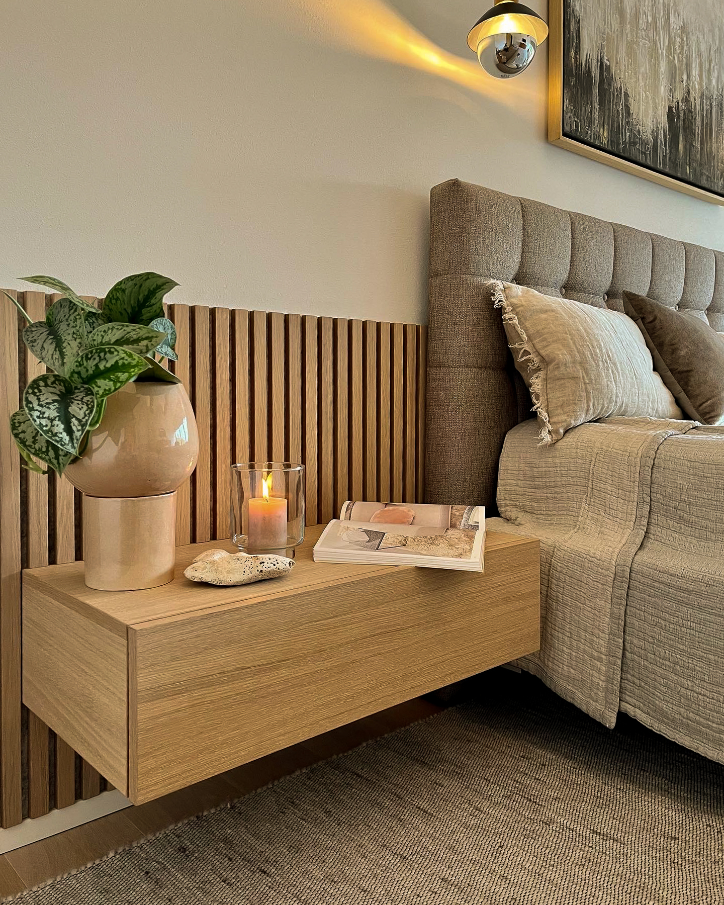 Met de juiste wandplanken maak je van je Akupanels een echt statement. Ze zijn eenvoudig te bevestigen en kunnen, net als je panelen, de natuurlijke look versterken. Denk bijvoorbeeld aan zwevende wandplanken die naadloos op je Akupanels passen.