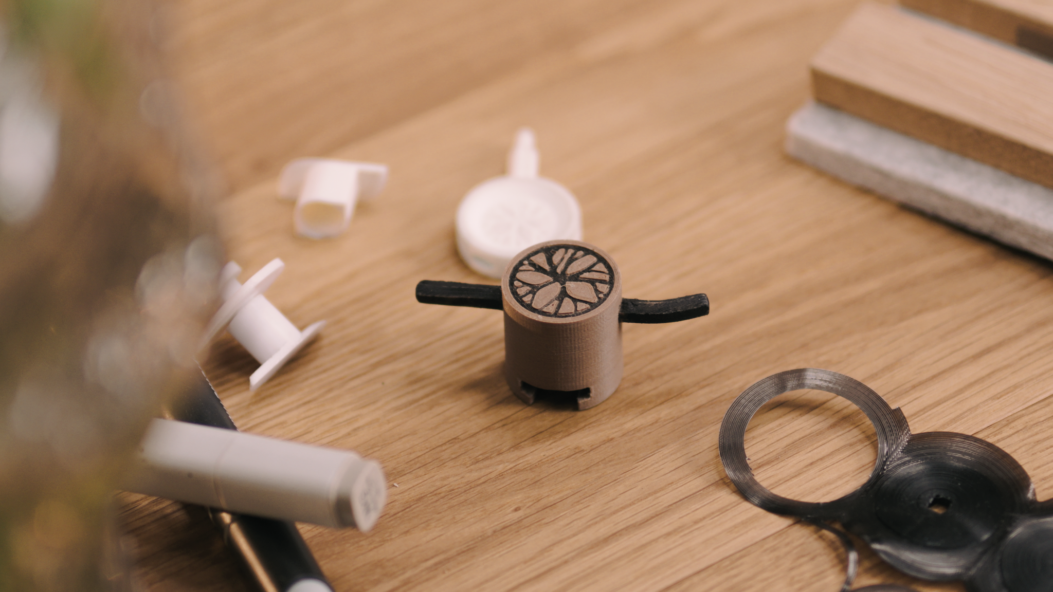 Martin houdt ervan om slimme, eenvoudige oplossingen te vinden voor complexe problemen. Zijn eerste schetsen richtten zich op het ophangen van fotolijsten. Hij maakte een 3D-geprint prototype met vleugels die zich vastklemmen achter de latten, vastgezet met een soort mini-bankschroef mechanisme.