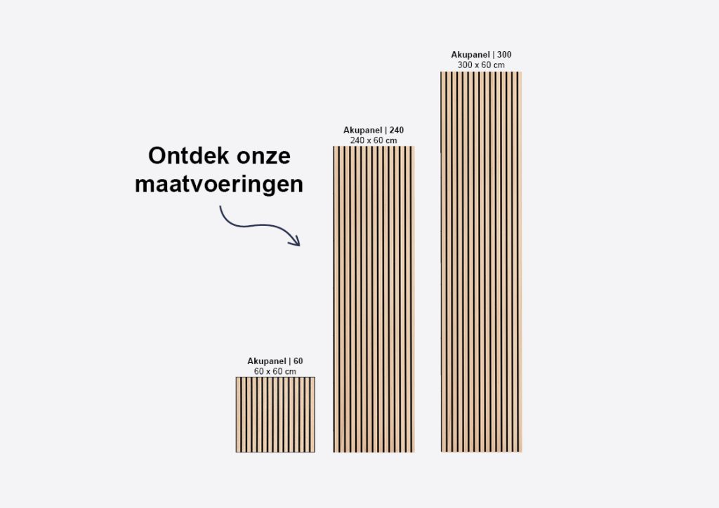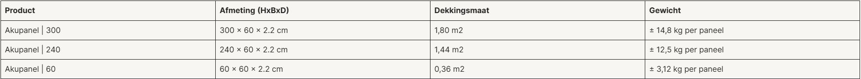 We hebben drie verschillende afmetingen van het Akupanel. Hieronder vind je een overzicht van de afmetingen en het gewicht per paneel, zodat je precies weet wat je kunt verwachten tijdens montage en installatie.