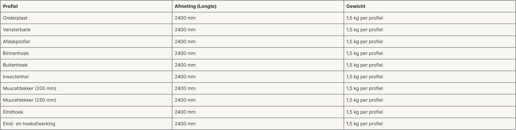 - Afdekprofiel: voor afwerking van de zijkant van een raam en/of deur