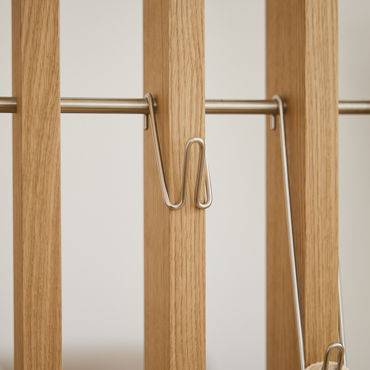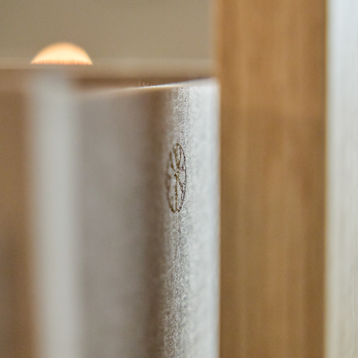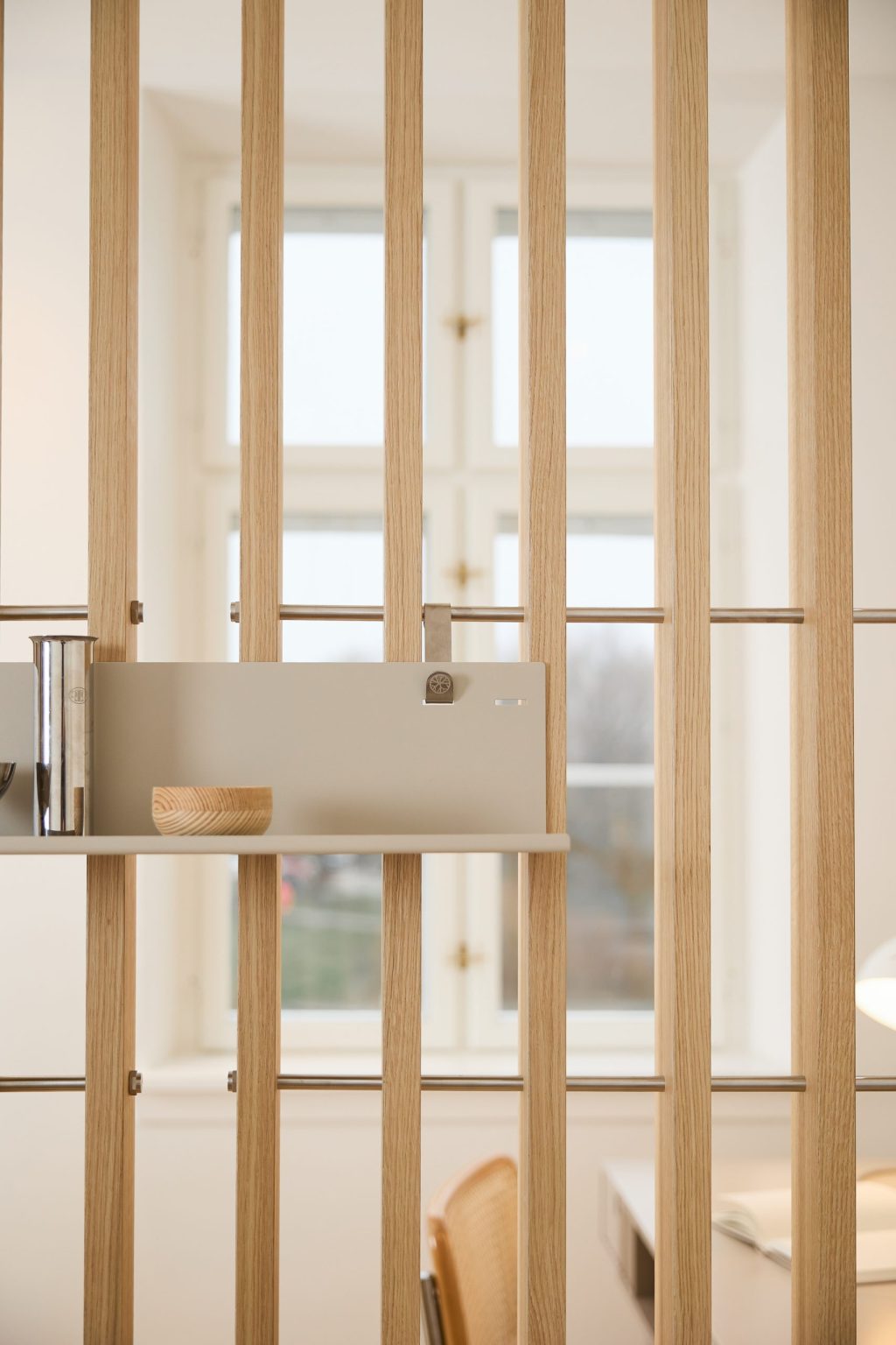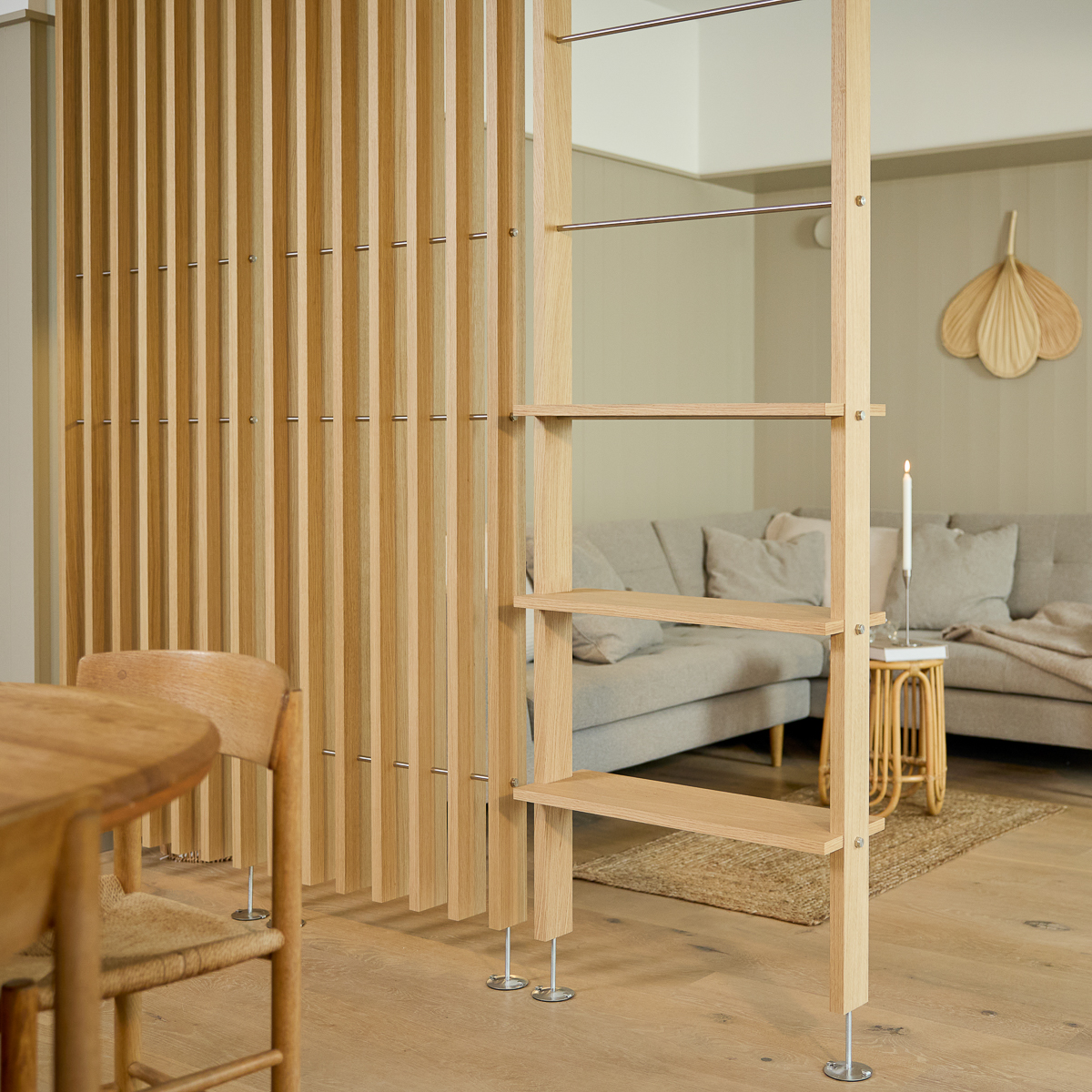 Embrace | BM1 is een van de twee kernmodules in het Embrace-systeem. Gemaakt van eikenfineer en roestvrij staal, monteert BM1 tussen vloer en plafond en helpt het om duidelijke zones te creëren met structuur en doel.