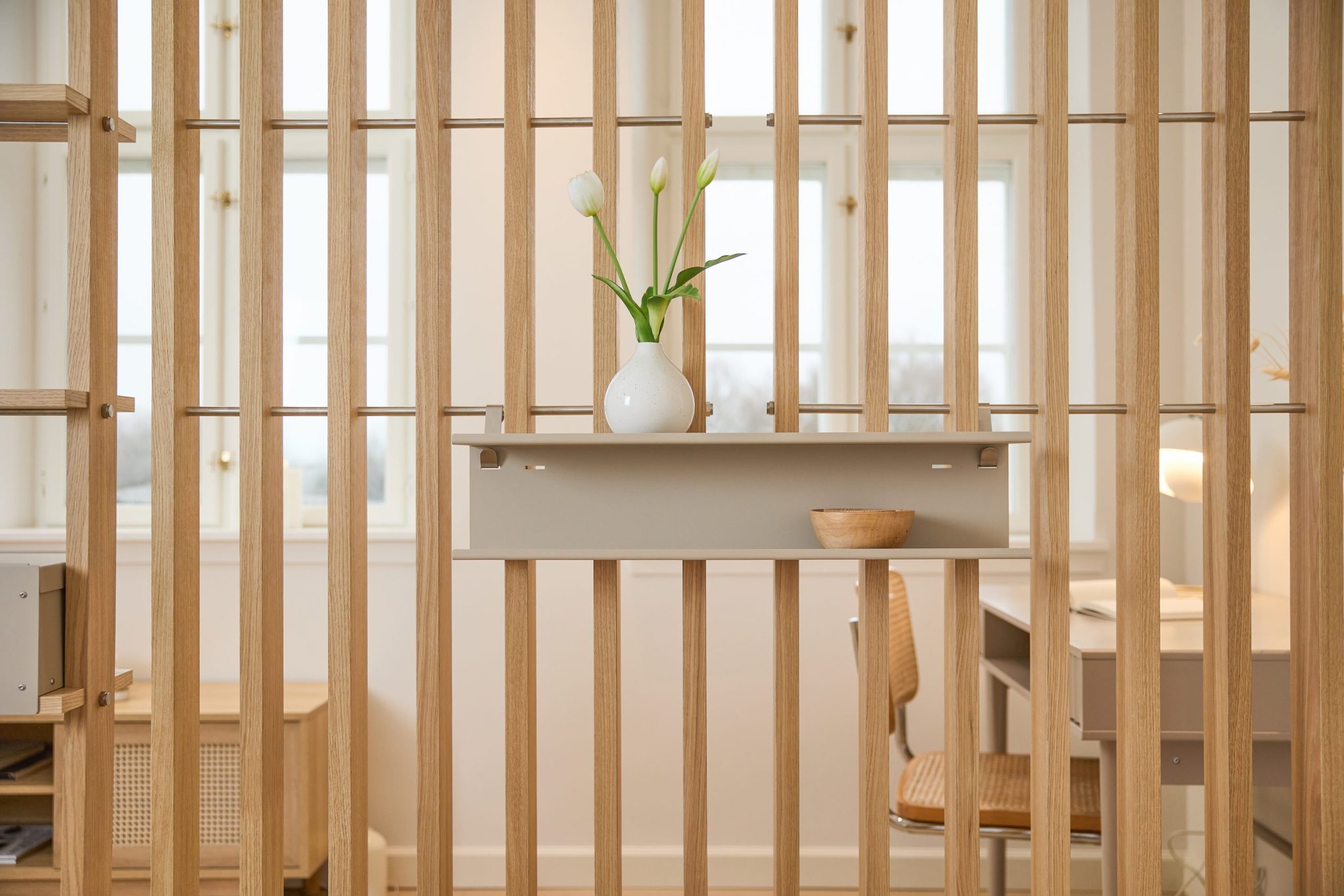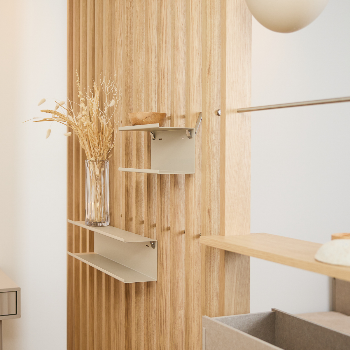 De Nell Double Metal Shelf geeft je extra opslag precies waar je het nodig hebt — zonder visueel gewicht toe te voegen. Het houdt alledaagse items en decoratie binnen handbereik, terwijl het open ontwerp helpt de Embrace room divider licht, schoon en opgeruimd te houden.